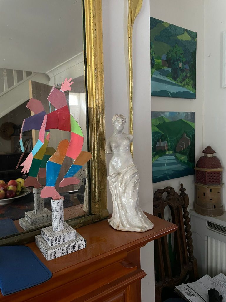 Walking downstairs, John shows me a set of maquettes that he made out of aluminium sheets a few years ago. Inspired by Cubism, Picasso’s work in particular, the figures depict kings and acrobats. Next to a miniature replica of the Venus de Milo, one of these maquettes is painted in bright blocks of colour and balances on a decoupaged plinth: lines and grids combine in dynamic harmony. His mantelpiece – like the rest of his home – dances with a lifelong fascination with art, form, and play.