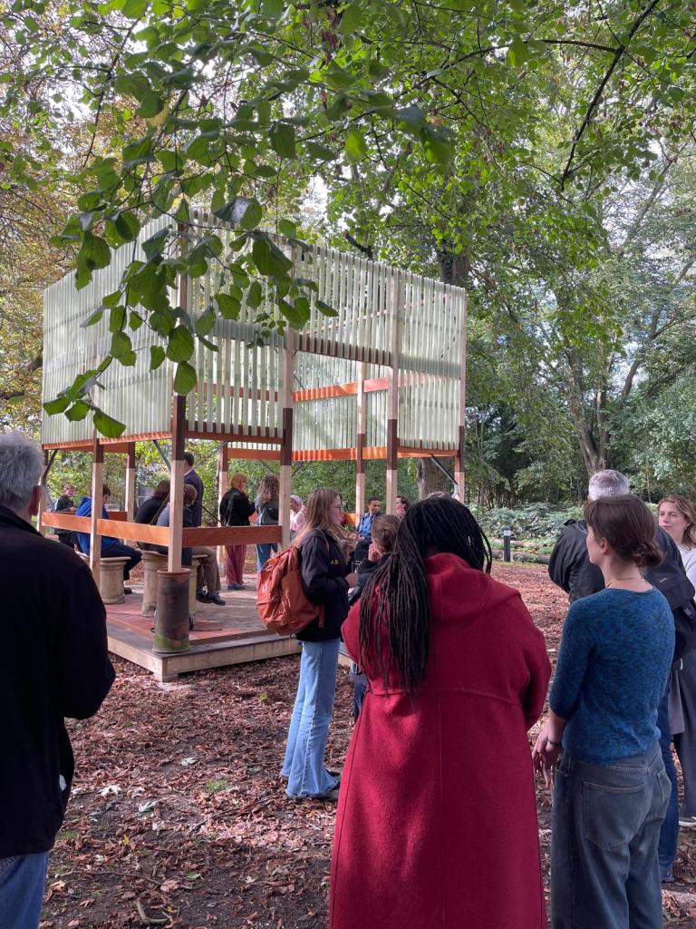 I ask about Minton’s hopes for the pavilion now that it is built. “I want people to feel the floor and look at the trees,” she muses, “go and enjoy it, sit on a bench and look up.”