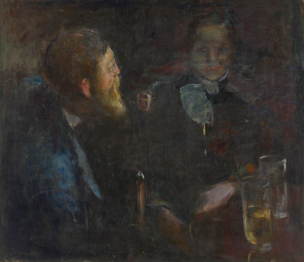 Time and time again in these portraits we see the tension between Munch’s realism and experimentalism. While he vividly captures the intellectual thrust of Europe’s elites, his desire to evoke a feeling which transcends the flesh produces surprising details. My favourite of these is in Munch’s portrait of his lawyer, Thor Lütken (1892), on show in the UK for the first time. It is an arresting piece, not least because of its sitter’s impeccable facial grooming, but more so because of a smudged, almost imperceptible mirage on what ought to be Lükten’s cuff: it is a couple, side by side, on the edge of a moonlit lake. One is in bridal white, the other barely visible, a black smudge who might be embracing her. Romance, mystery, love, and death are visible on the very surface of this portrait of professionalism. It was painted as Munch made his commitment to soul painting, and it reminds us of his intention to render vivid the too often suppressed currents of human emotion. Stanislaw Przybyszewski,writing in the first book published on Munch in 1894, described his style as ‘a painted philosophy’. Writing over a hundred and thirty years later, I can’t describe it much better than that.