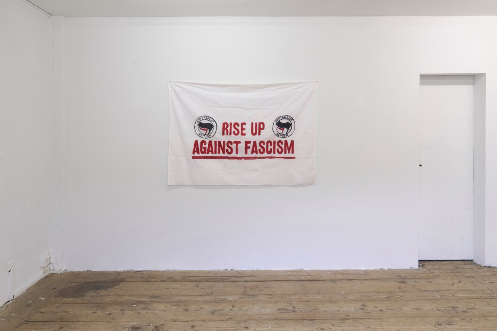 The second piece in the show sits in a separate room. A fabric banner pinned to the wall, bearing the slogan ‘Rise Up Against Fascism’, flanked by two anti-fascist logos (Fig. 2). At first glance, it looks like a protest flag, but it is not. The banner is in fact a hand-painted prop used in the HBO series Succession, again purchased by Anderson in an online auction. This tension between the real and its imitation complicates the reading of the work. What does it mean for a protest object to be a fiction? Or, inversely, for fiction to so closely mimic protest? The encounter alters the viewing of the rockets in the previous room. If the rocket is an action-object, so is the flag. Both are performative and both hold a promise.