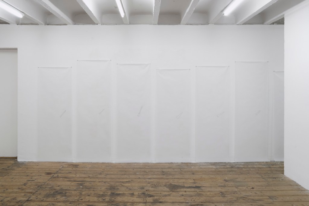 For this work, Anderson used the graphite to draw soft outlines of rockets, dozens of them (Fig. 1). In the process, he not only retools its historical function but queers it, destabilising its militaristic and masculine associations by subjecting it to delicate, repetitive mark-making. Each outline is traced by hand in barely-there graphite lines on translucent vellum sheets pinned to the gallery walls in rhythmic succession. The forms correspond to actual rockets launched between 1944 and 2025: those used for discovery and those used for death and diversion. Anderson’s description of his practice as probing ‘how close can you get without becoming literal’ echoes in every quiet line.