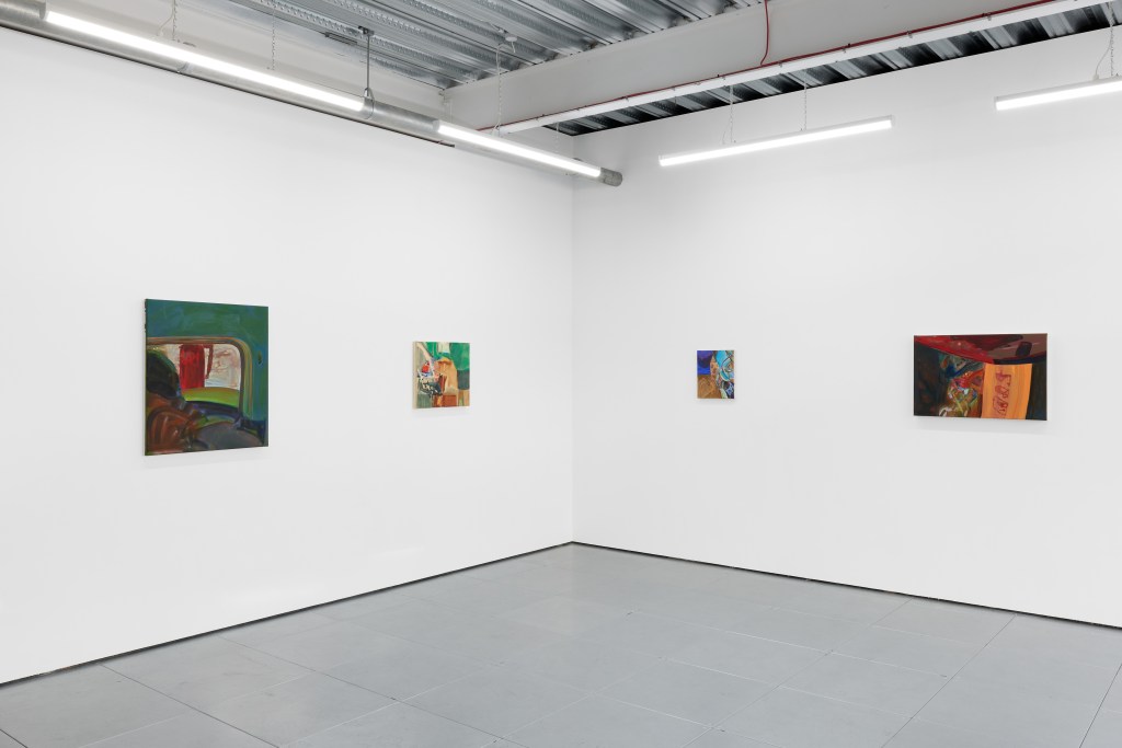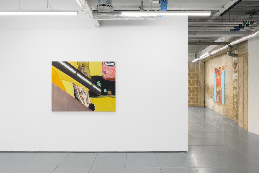 ‘Marina’ consists of eleven new paintings made over the last year. Barratt’s paintings emerge from photos of Glasgow’s industrial cityscape taken on her phone during her daily walks to the studio. Though the titles of her paintings (‘Gas Leak’, ‘Out of Doors’, ‘Poolside’, ‘Vegetation’) suggest their origin in photographs of real things, she crops these photos to the point where the subject matter is no longer instantly recognisable. This means her compositions lie somewhere between close-up figuration and defamiliarizing abstraction. We know we are seeing a detail or part of something but we can’t quite place it, make sense of it, or put it in context, and the effect is disorientating—encouraging the viewer to slow down to parse these arrangements of industrial detritus.
