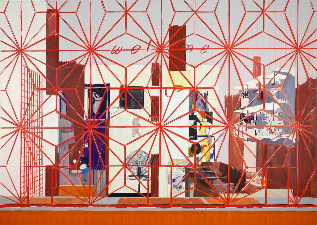 By working with received images and grids, Anderson’s work actively investigates and questions the relationship of painting to photography. Anderson’s pictures often use the grid to structure and measure his strong vertical and horizontal forms – as something both to draw on and to work against. The grid – a classical pictorial device which looks back to Alberti and is concerned with compositional organisation and control – is a common motif, appearing behind the organic gesture of a tree canopy, an area of foliage, invoked by the rectangular posters on the barbershop wall and resurrected in the series of ‘country club’ paintings that look through patterned red security grilles, gates, beaded curtains, and chicken wire.