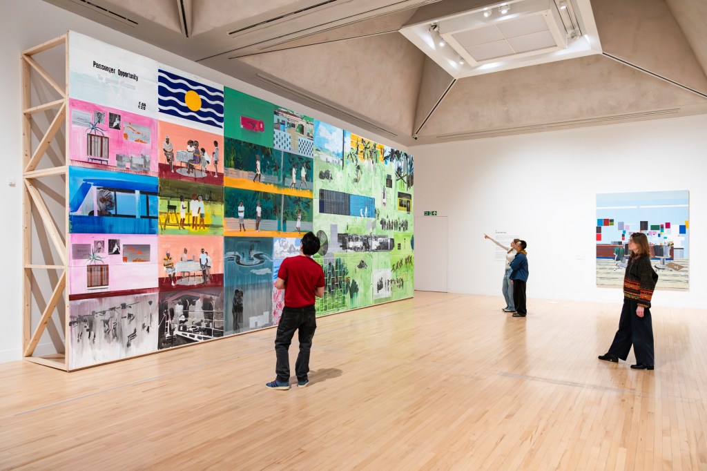 The exhibition includes a paint-stained photographic collage Anderson assembled as the source material for his Audition (1998), which depicts a vast swimming pool with tiny figures crowded on the upper diving board. Others, waiting by the pool, are suggested by dark outlines, while rippling water is intimated by a calculated, web-like pattern on the surface. The palette is cold: greys, shocks of light blue, white splashes as someone jumps in. Anderson uses the photo collage to create a believable interior space, but exaggerates the interior’s scale for dramatic effect. On the subject of scale, the largest painting in the exhibition, Passenger Opportunity (2024-25), spans the side of multiple crates stacked the length of the room, and juxtaposes histories of violence with scenes of ordinary life in black communities, portraying a parade of slaves, people having dinner, a man waiting in a car, a couple embracing.